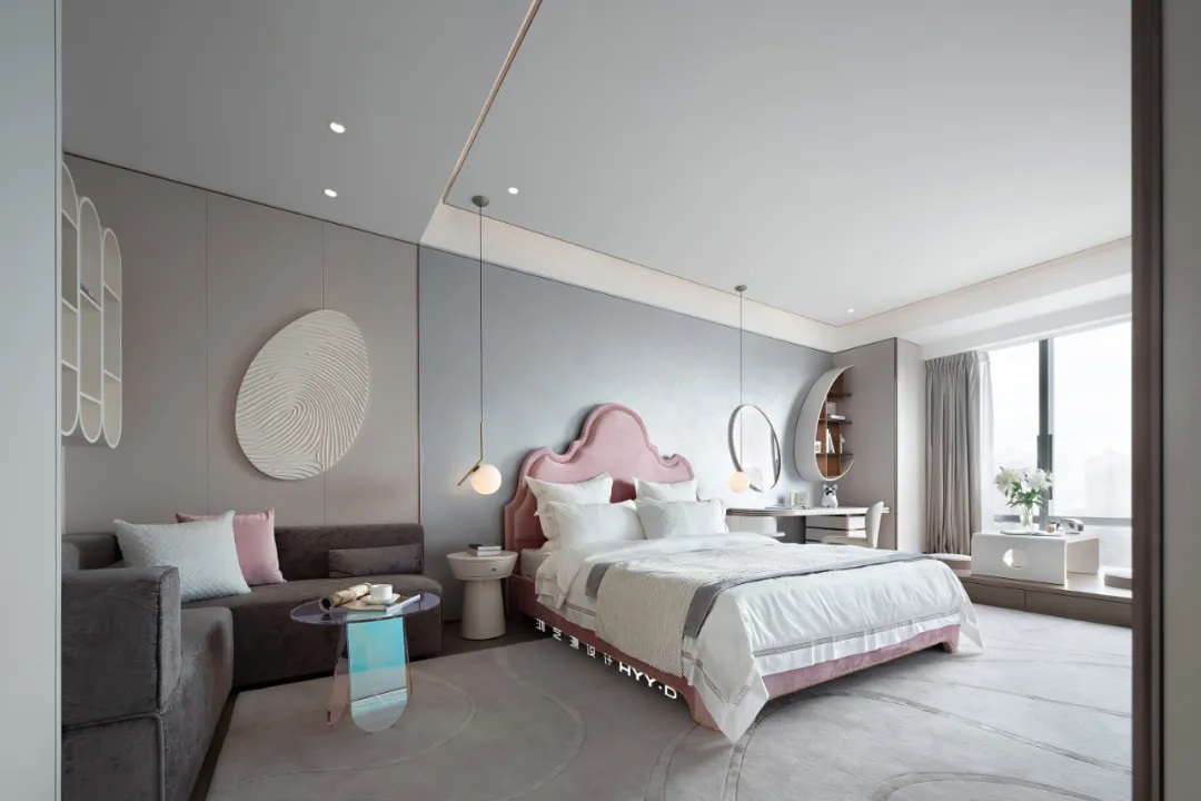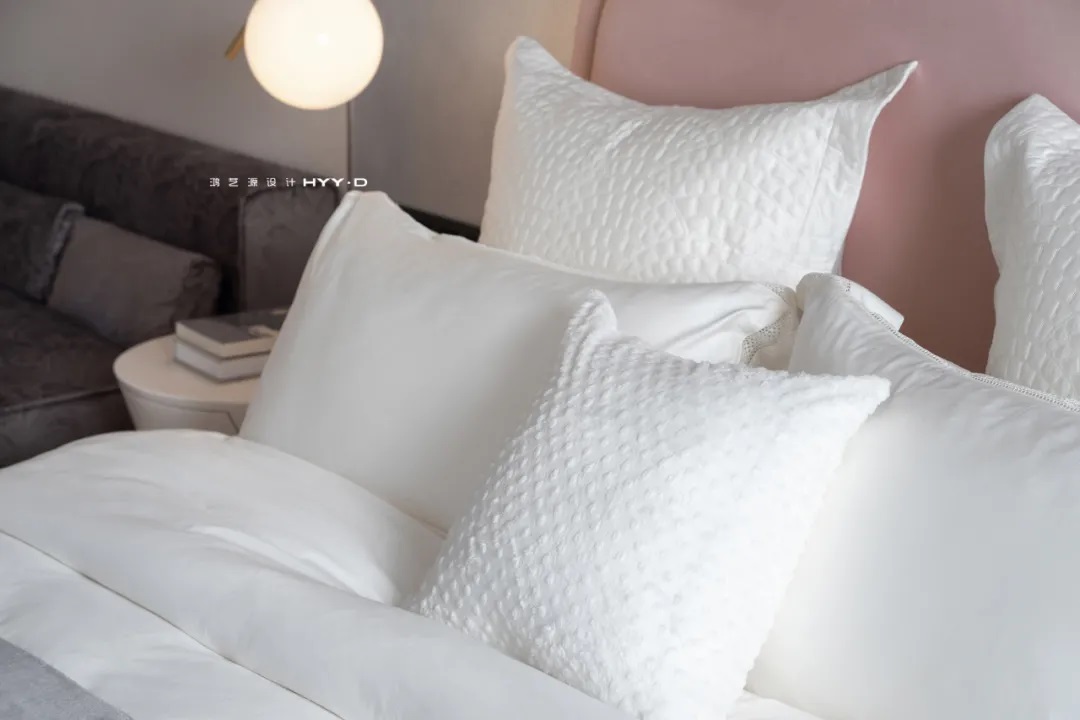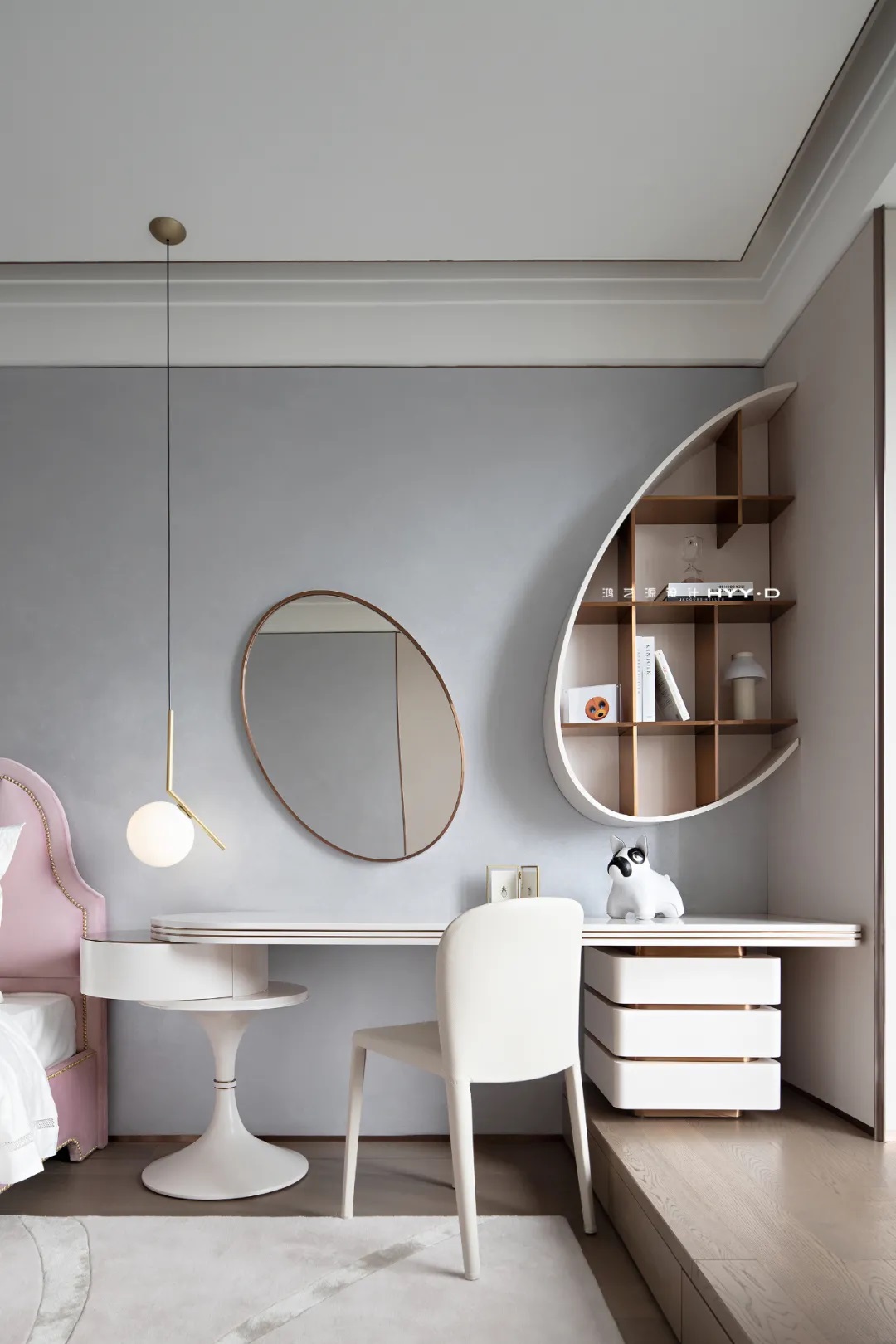 從踏入房間的那一刻起,腦海里便浮現(xiàn)了多功能的生活場(chǎng)景,視線和思緒都變得柔軟起來。軟飾上選用象牙白、浪漫粉、月光灰,融入幾何美學(xué),彰顯女孩的柔美爛漫,讓人如沐春風(fēng),閨蜜小聚、閱讀閑聊,觀景休憩,功能和情感之外,設(shè)計(jì)創(chuàng)造了額外的思考空間陪伴成長。